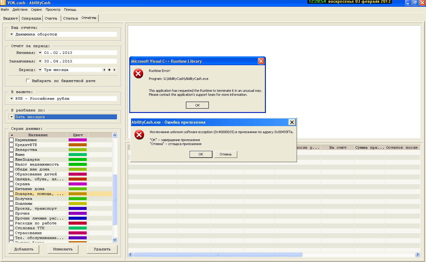 Динамика оборотов->любой период->в разбивке по пять месяцев->runtime error. Последовательность действий Динамика оборотов->любой период->в разбивке по пять месяцев->runtime error Файлы: | |